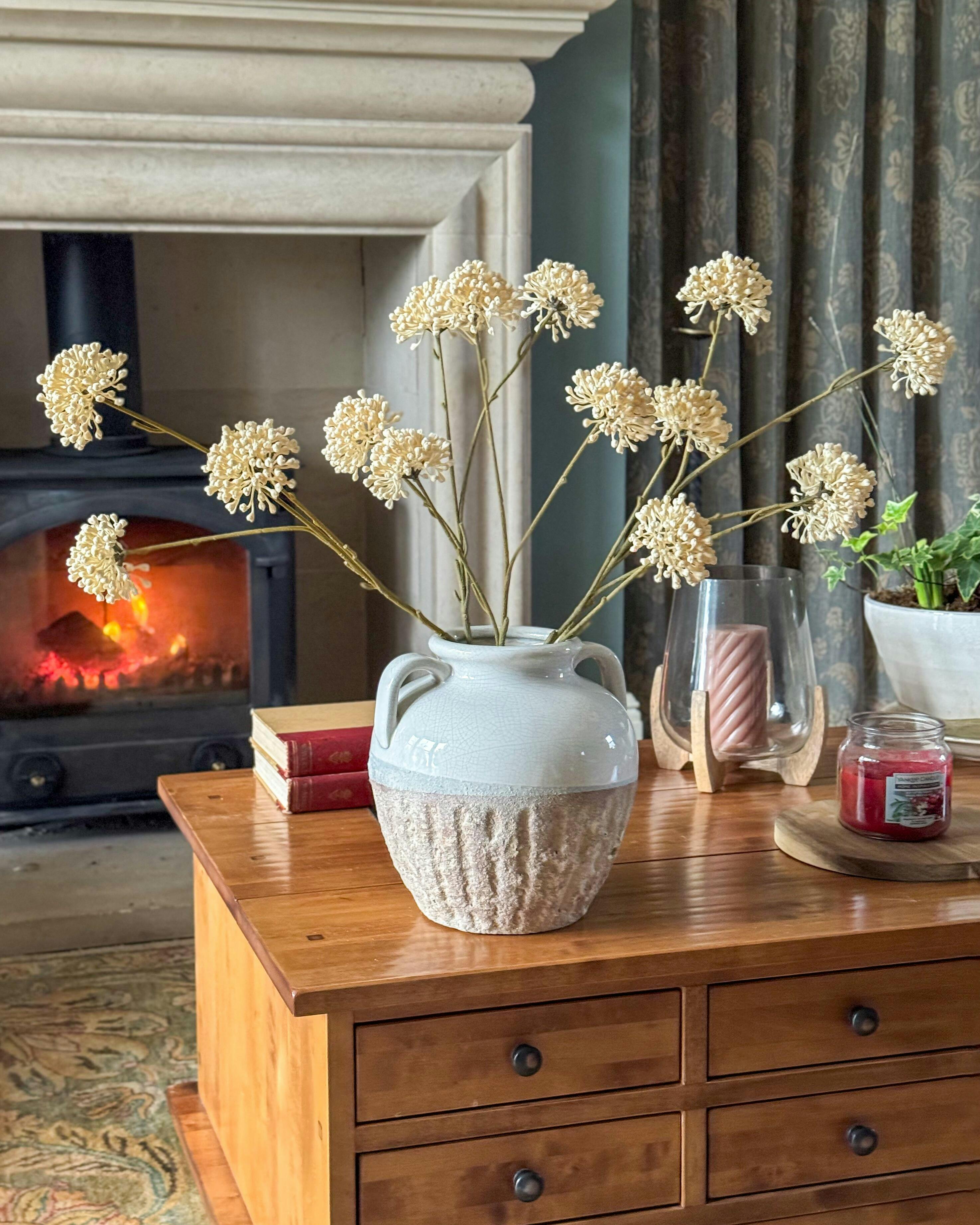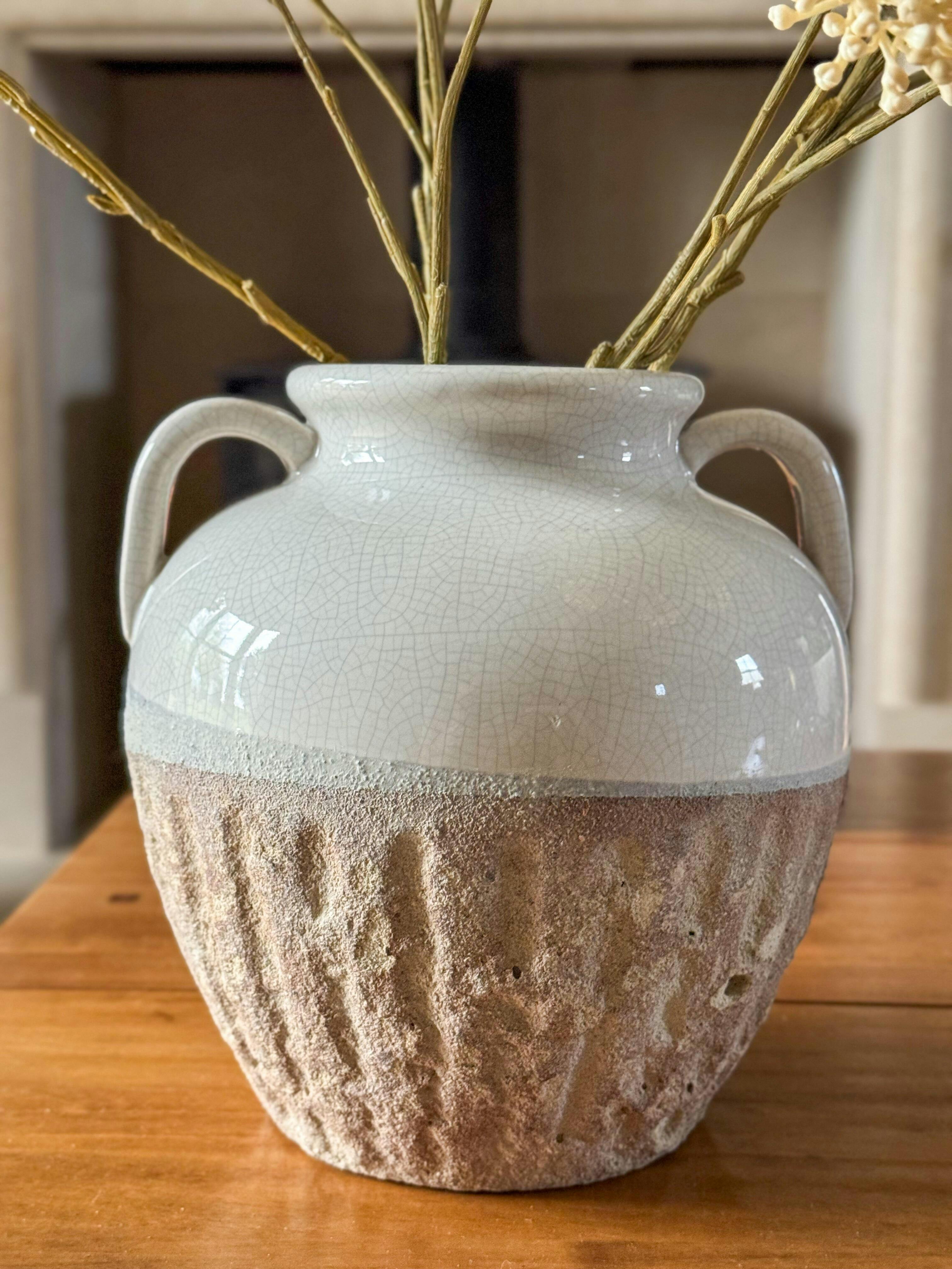 This Thorne White And Beige Amphora Rustic Vase will add rustic charm to any room. Its unique amphora shape will make a statement, while the white and beige hues will bring a touch of sophistication. Perfect for displaying flowers or as a standalone piece, it's a must-have for any home decor enthusiast!